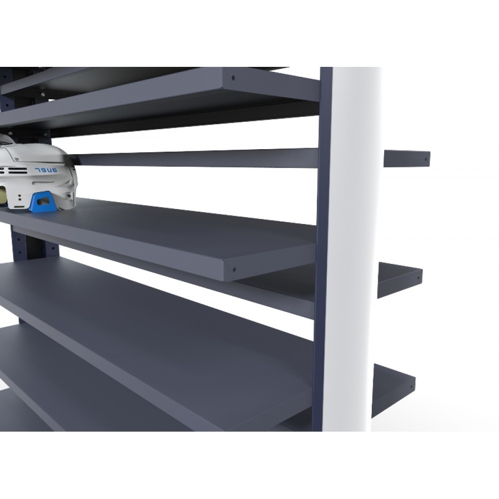 Сборно-разборная конструкция данного стеллажа позволяет значительно экономить на транспортных расходах. Регулировка полок с шагом в 5 см., позволяет настраивать расстояние между полками под любую высоту ботинка. Так же, при необходимости можно приобрести дополнительные полки. Соединение металлических элементов стеллажа посредством оцинкованных винтов с внутренним углублением под шестигранный ключ, а гайки имеют фланец с насечками, что позволяет при затягивание винта гайку придерживать лишь пальцами без помощи ключа.
