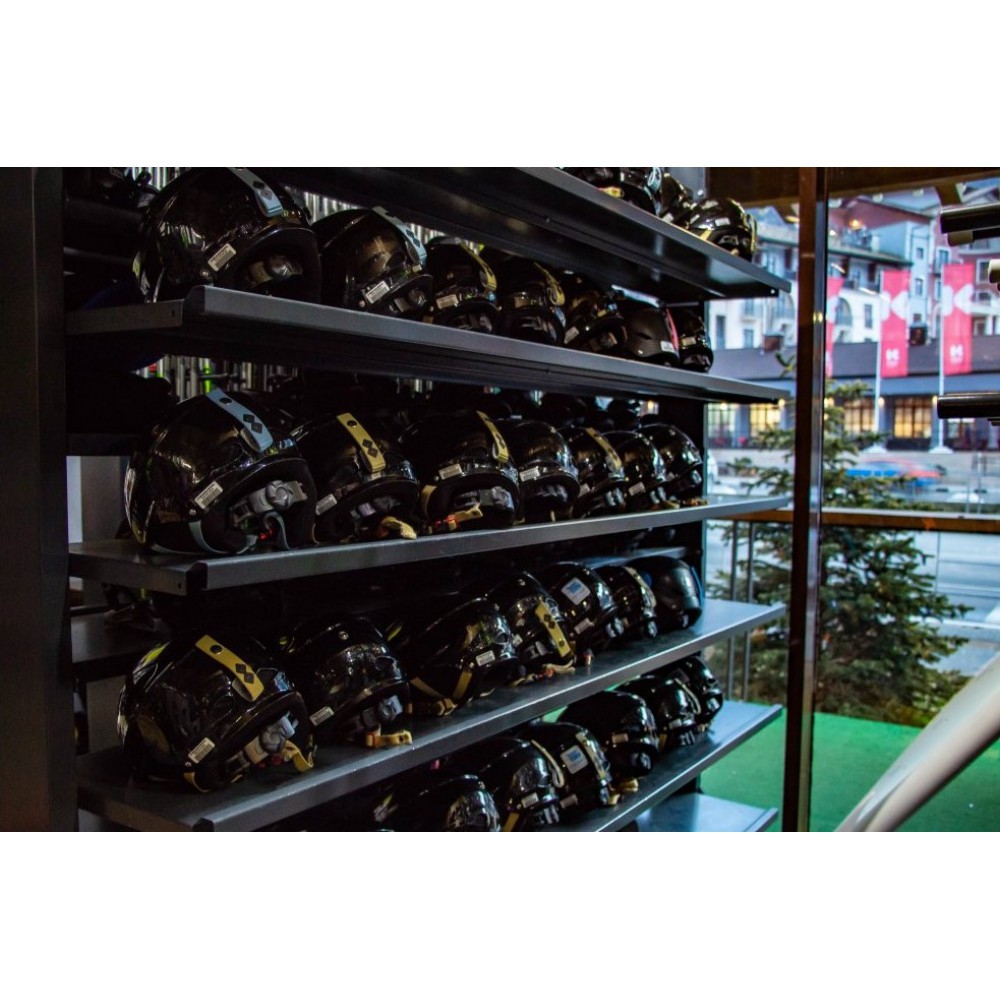 Шлемы легко устанавливаются в стеллаж и так же легко вынимаются.