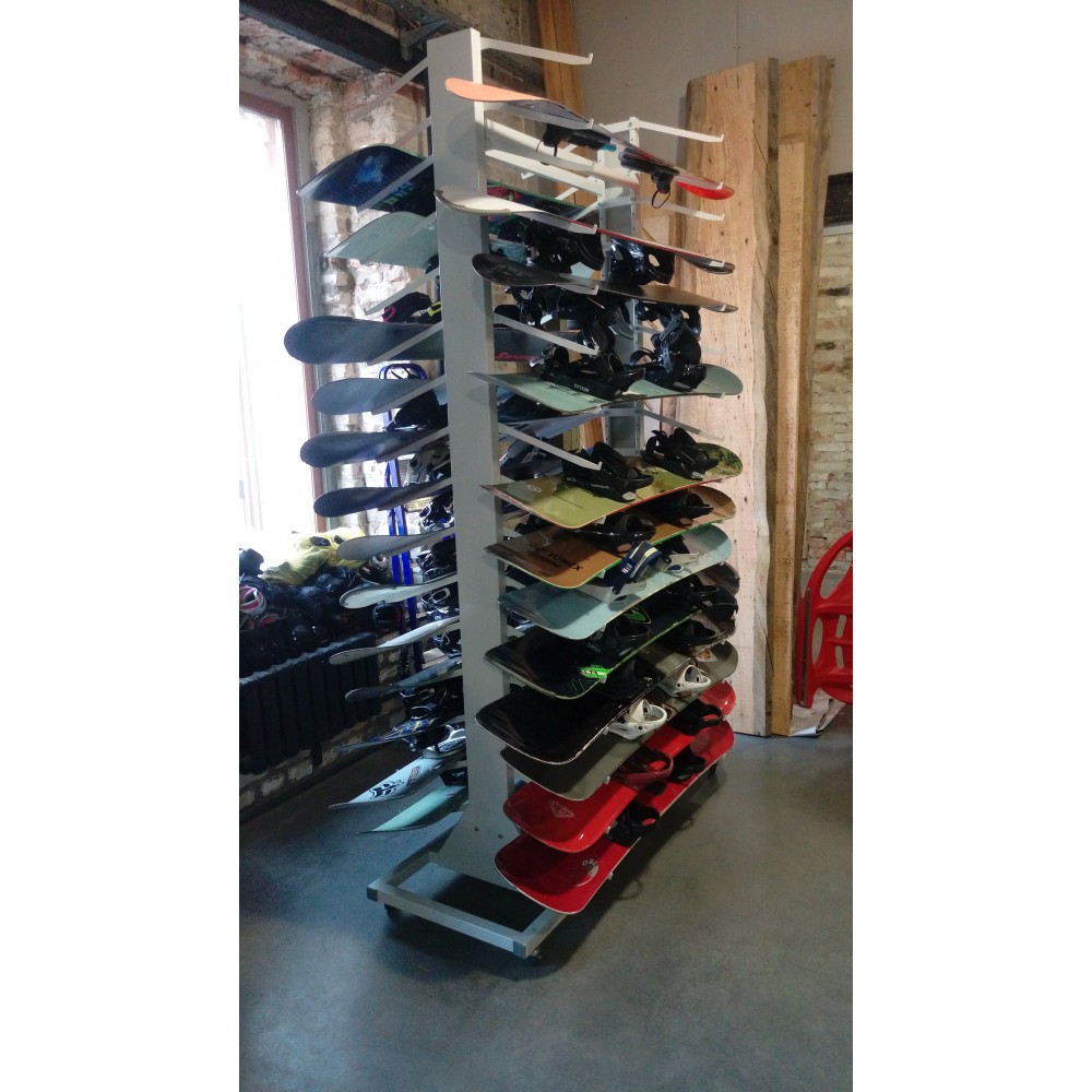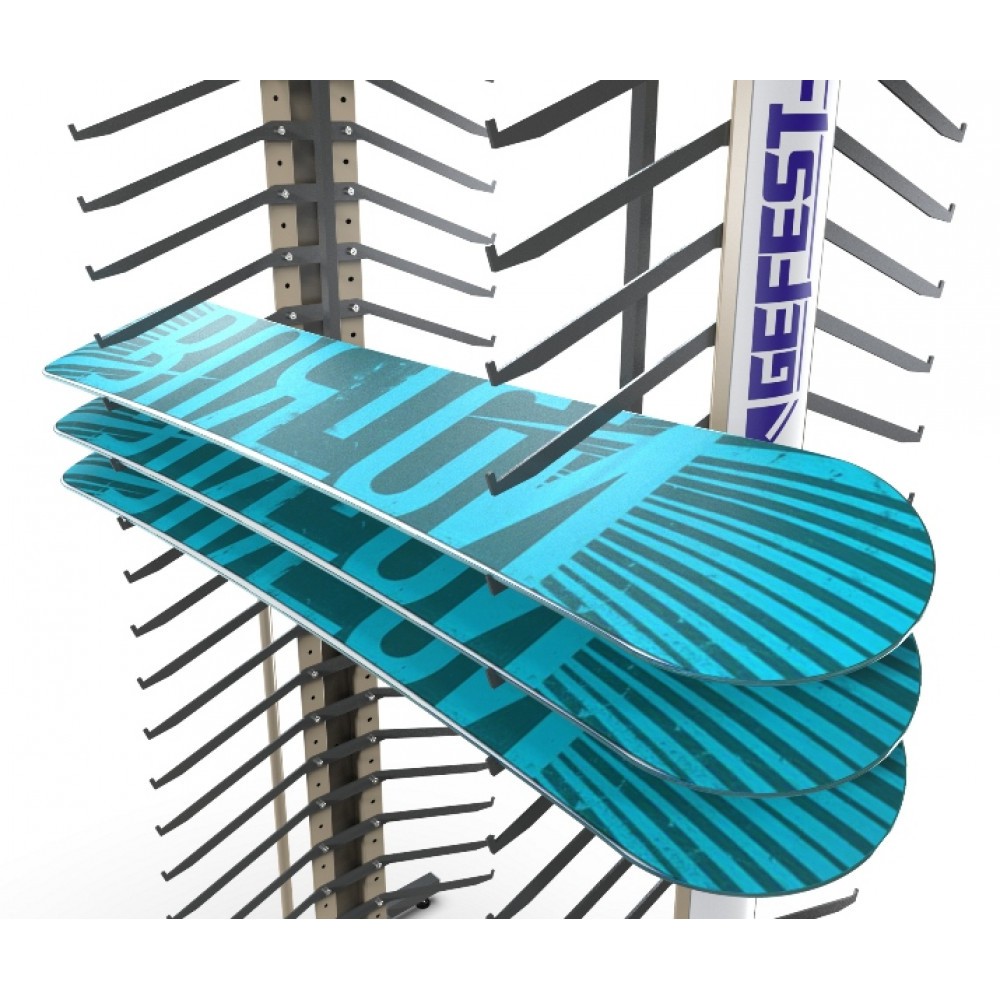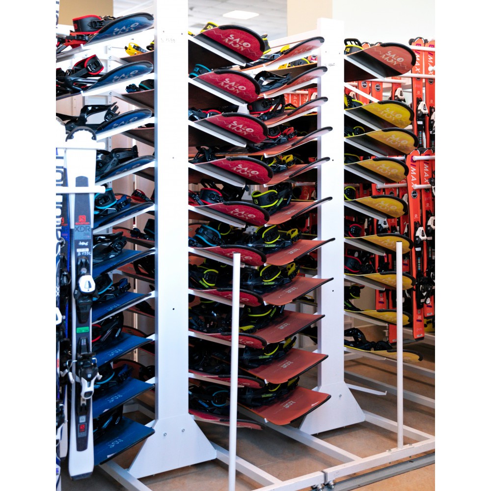 В стеллажах данной серии сноуборды размещаются в горизонтальном положении, в индивидуальных ячейках. Держатели сноубордов имеют наклон, благодаря которому сноуборды надежно ложатся в ячейки и защищены от падения.