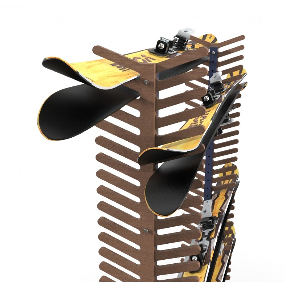 Размещение инвентаря в данном стеллаже осуществляется в горизонтальном положении, в индивидуальных ячейках. Фанерные держатели имеют наклон, благодаря которому сноуборды надежно ложатся в ячейки и тем самым надежно защищены от падения.