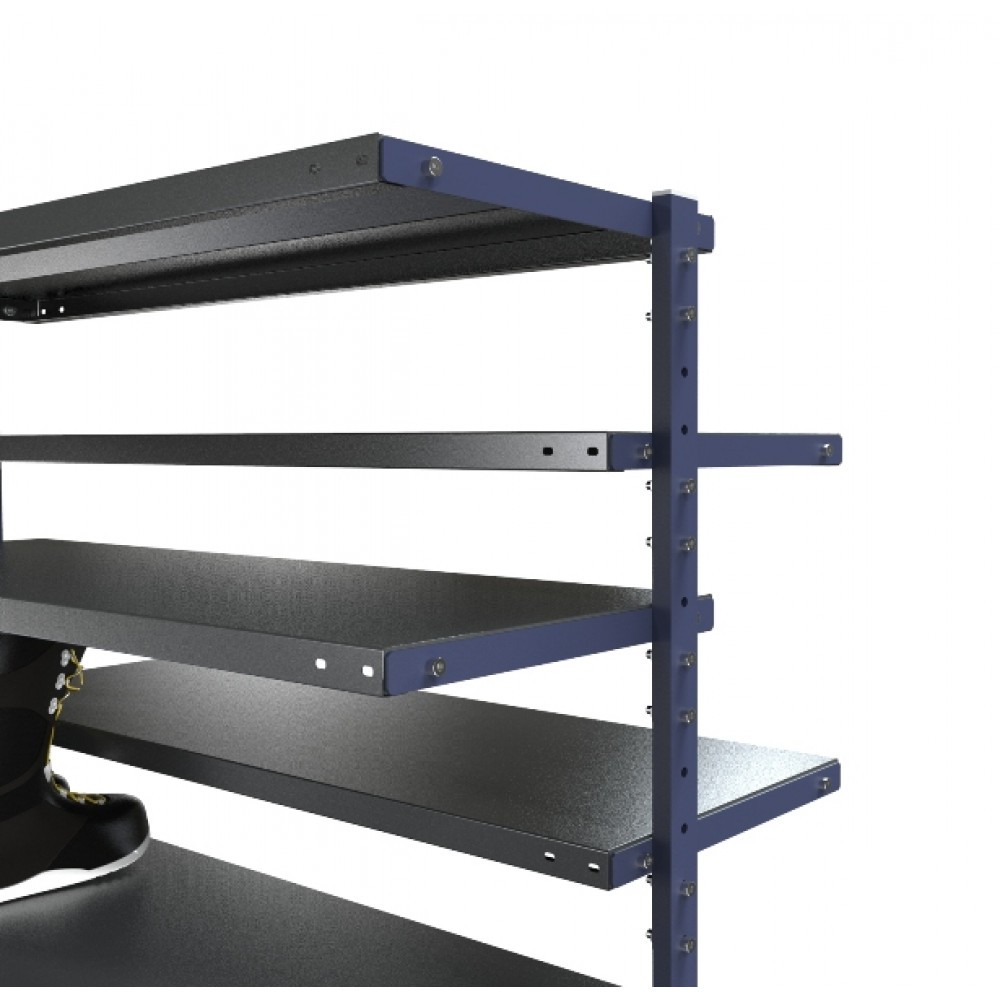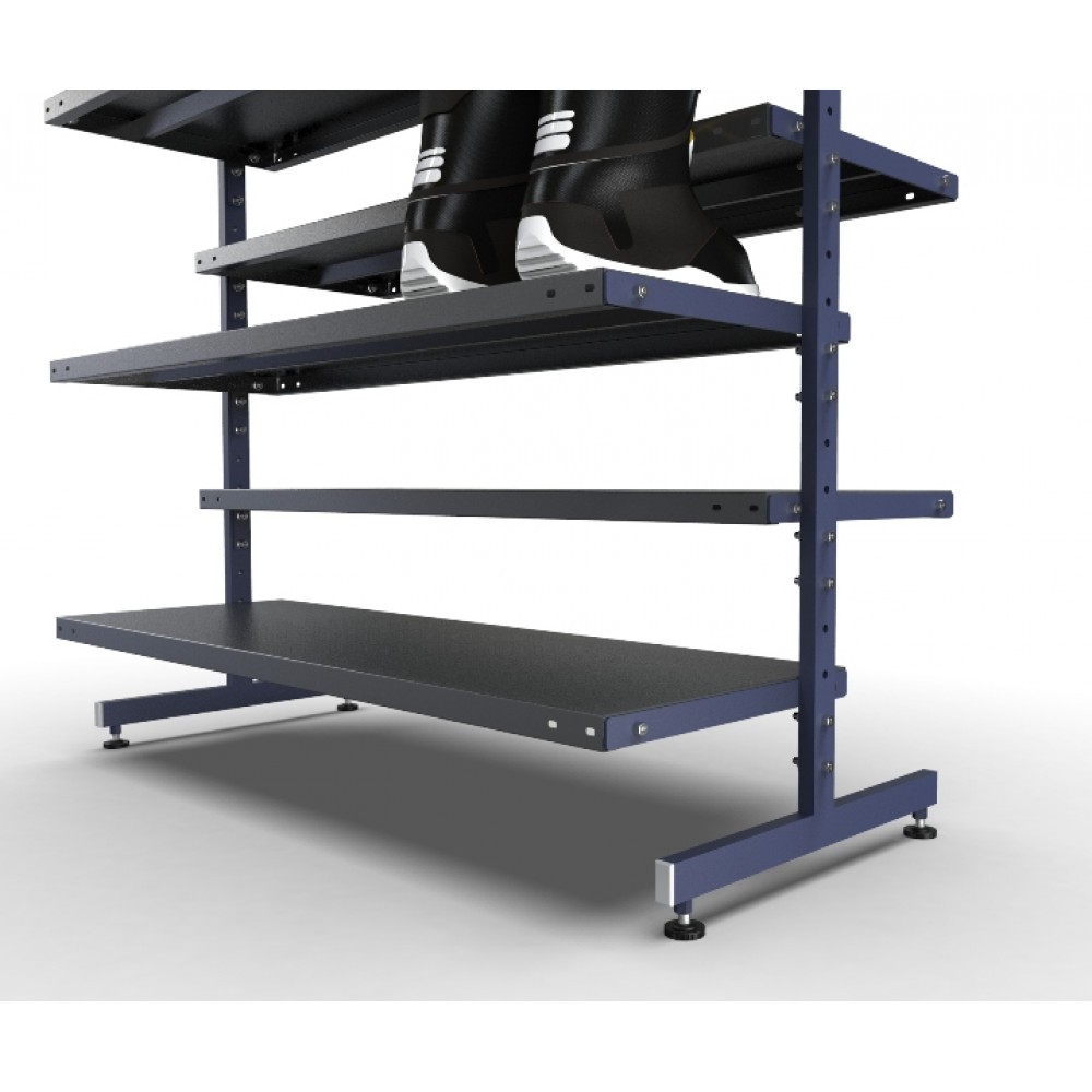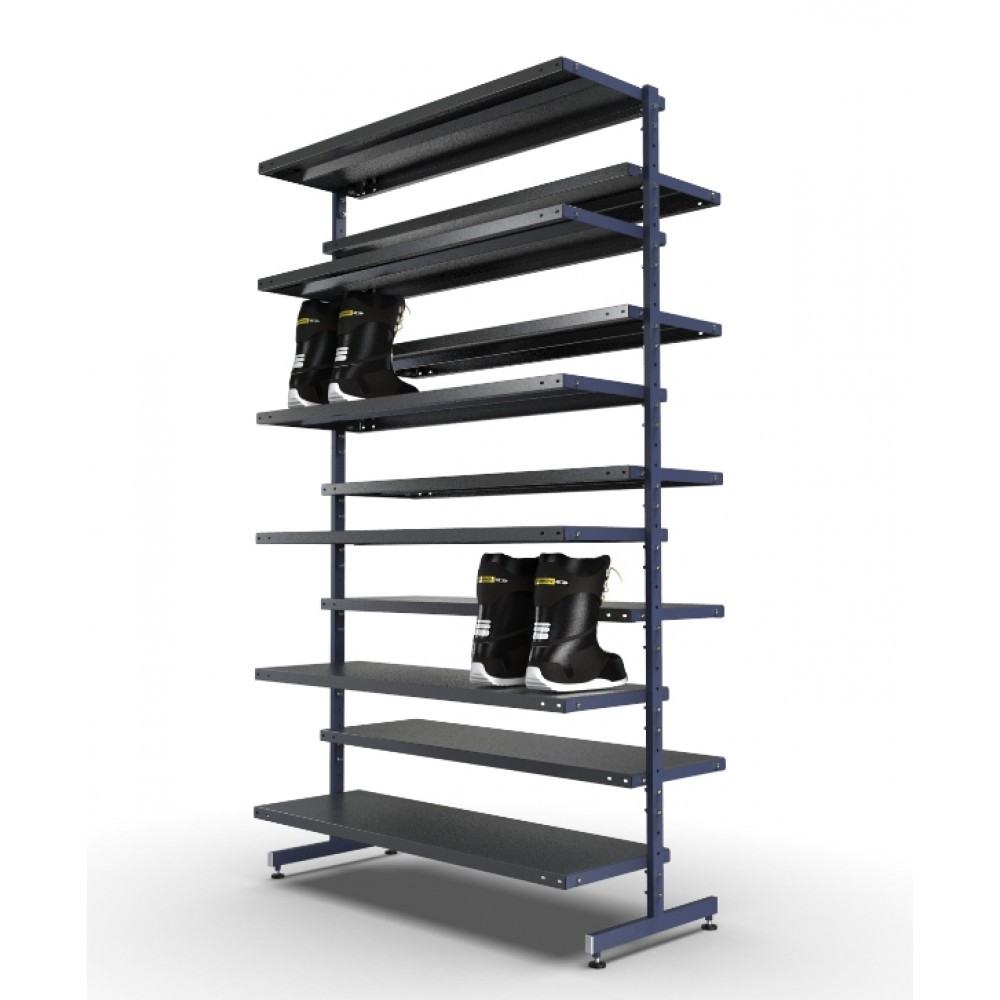 Сборно-разборная конструкция данного стеллажа позволяет значительно экономить затраты при транспортировке. Регулировка полок с шагом в 5 см., позволяет настраивать расстояние между полками под любую высоту ботинка. Так же, для увеличения мест хранения,возможно приобрести дополнительные полки.