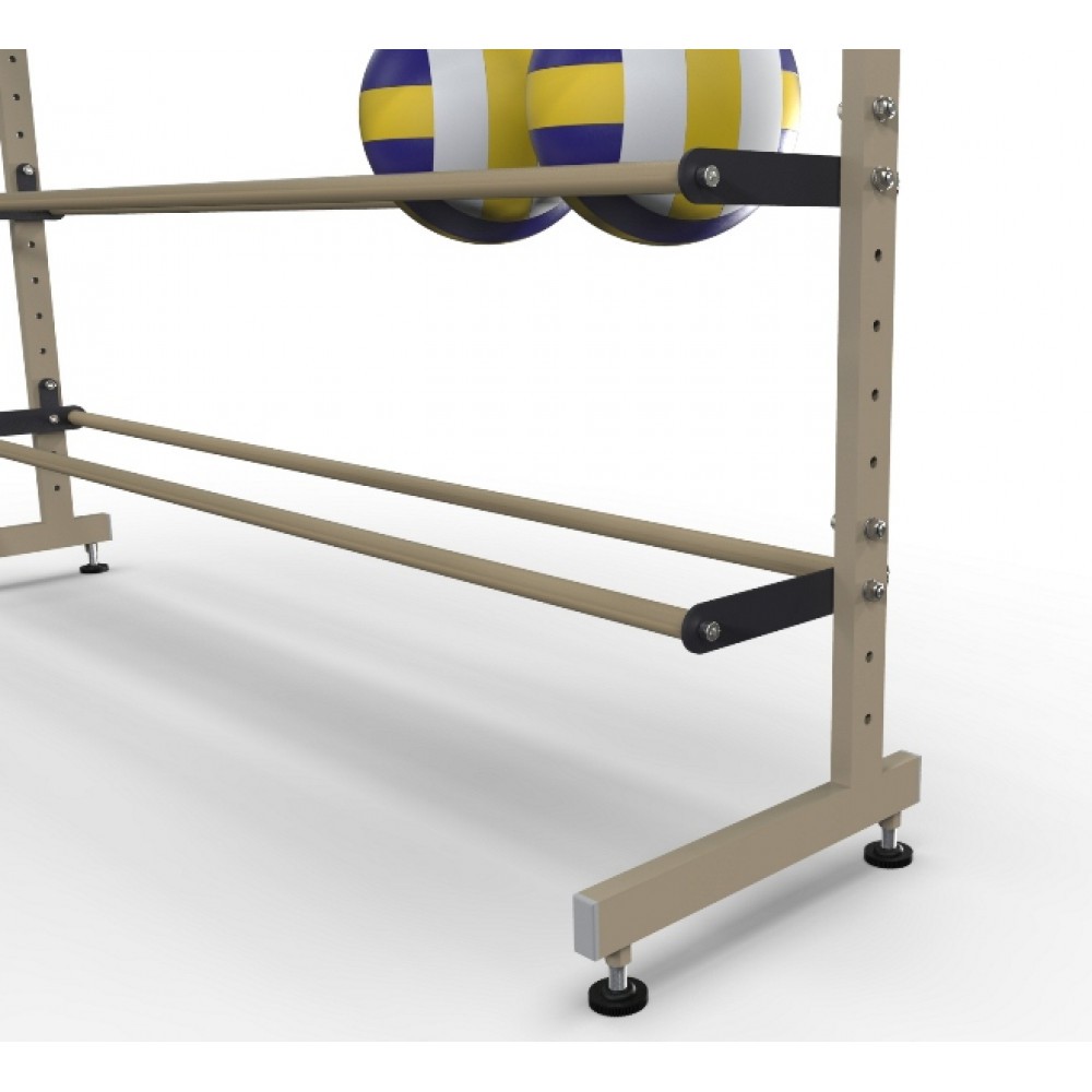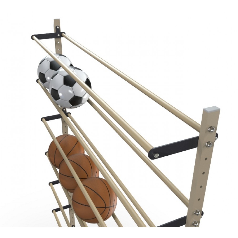Конструкция стеллажей для хранения мячей сборно-разборная. Благодаря регулировке горизонтальных держателей-полок с шагом в 5 см., возможна настройка расстояния между полками под разный диаметр мячей.