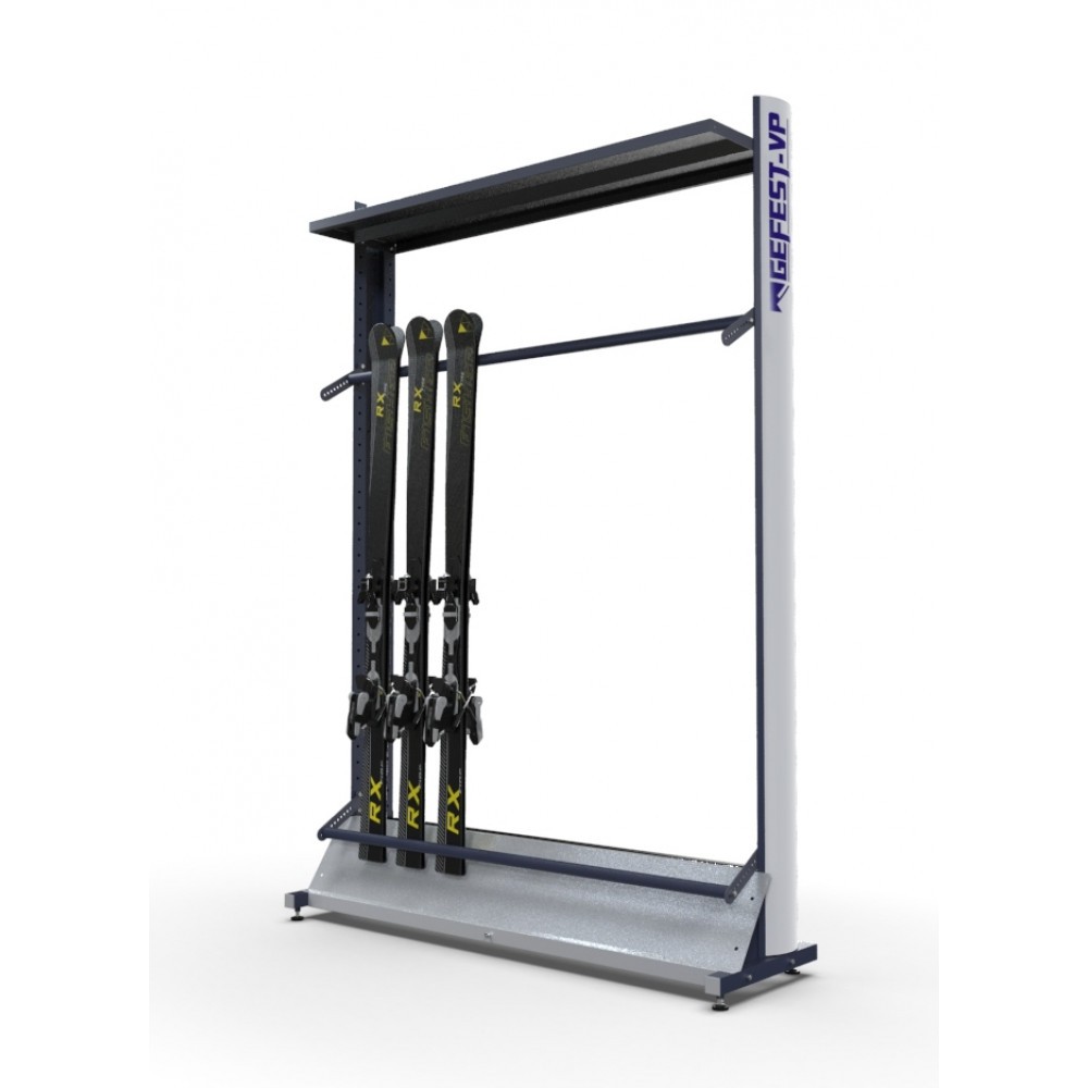 Горнолыжные стеллажи имеют сборно-разборную конструкцию. Конструктив данных стеллажей предусматривает регулировку горизонтальных держателей лыж с шагом в 5 см., благодаря данной регулировке возможна установка и хранение лыж различных видов, включая все горные и беговые, а также сноуборды. Проверенная временем трехточечная система фиксации позволяет быстро и в то же время надёжно установить лыжи в стеллаже. Дополнительно установленная полка позволяет размещать и хранить спортивную экипировку различного типа, будь то шлемы, ботинки, крепления и др.