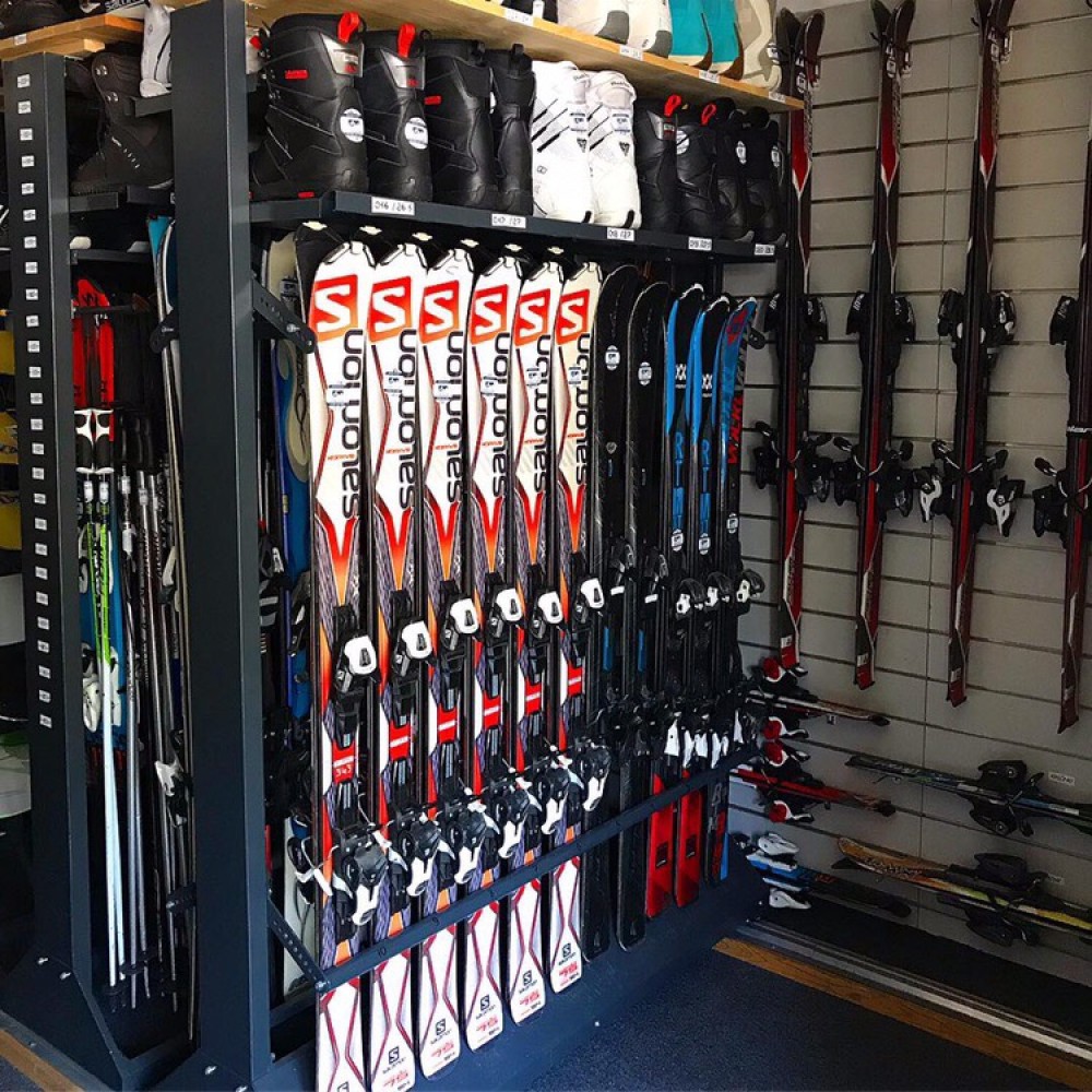 Благодаря дизайнерскому виду стеллажа, он больше подходит для салонов проката на горнолыжных курортах, торговых магазинах, спортивных комплексах.
