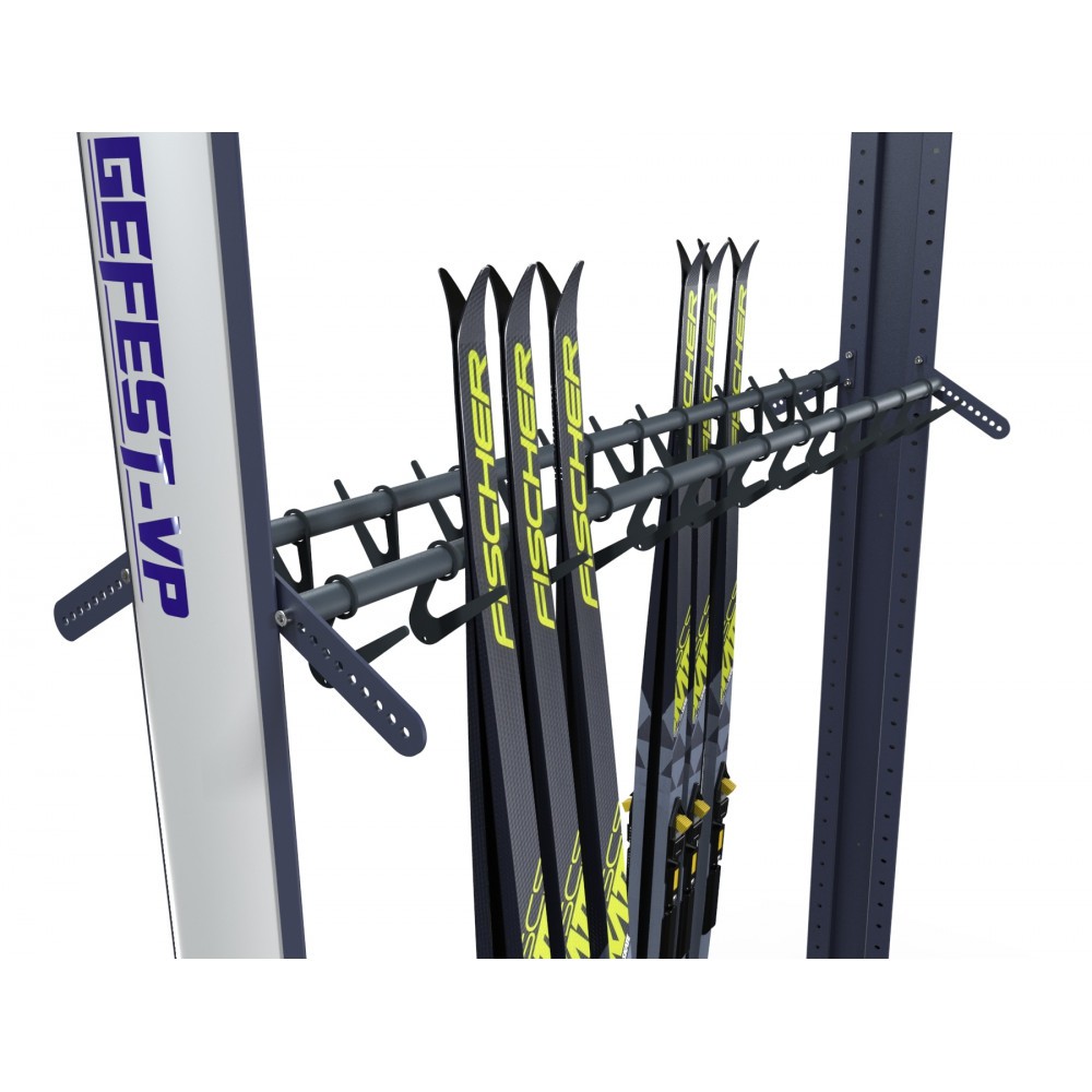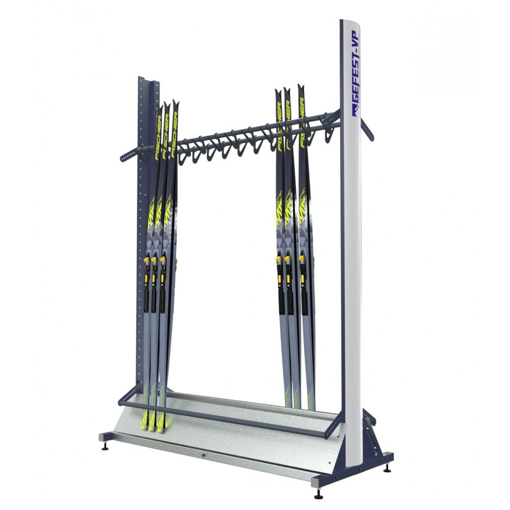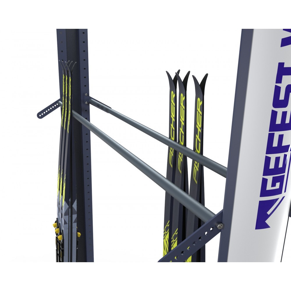 Лыжные стойки имеют сборно-разборную конструкцию. Конструктив данных стоек предусматривает регулировку горизонтальных держателей лыж с шагом в 5 см., благодаря данной регулировке возможна установка и хранение лыж различных видов, включая все беговые и горные, а также сноуборды. Проверенная временем трехточечная система фиксации позволяет быстро и в то же время надёжно установить лыжи в стеллаже. Дополнительно установлены вешалки-крючки для размещения лыжных палок. Палки хранятся "за петлю".