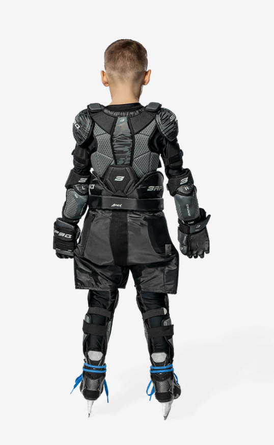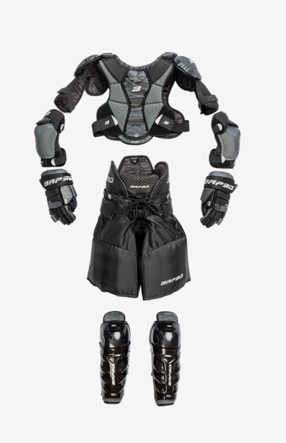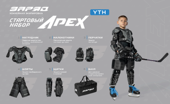 «ЗаряД Apex» — это первый шаг к большим победам в мире хоккея. Специально разработанная линейка для начинающих игроков, сочетающая в себе отличную защиту и максимальный комфорт. В стартовый набор "Apex" входит: нагрудник, налокотники, перчатки, шорты, щитки, баул. Набор представлен в трех размерах: S, М, L.