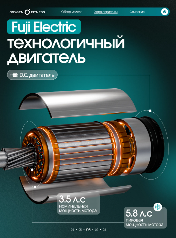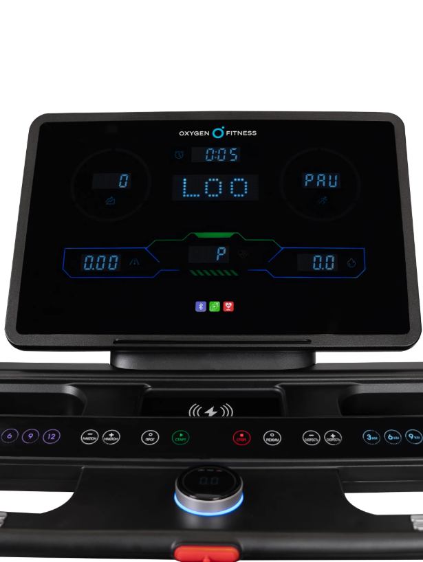 OXYGEN FITNESS COPPER — мощная электрическая беговая дорожка премиального уровня для полукоммерческого использование с интенсивной нагрузкой. Модель ориентирована на пользователей, которым важны высокая скорость, широкий беговой простор, продвинутая амортизация и современные технологии комфорта. COPPER подходит как для регулярных пробежек, так и для серьёзных тренировок с электронным наклоном и контролем показателей, обеспечивая ощущение клубного уровня у себя дома. В основе дорожки — массивная высокопрочная рама с антикоррозийной обработкой и двухслойной покраской, рассчитанная на долгий срок службы. Корпус выполнен из ударопрочного полистирола HIPS, устойчивого к механическим нагрузкам. Беговое полотно размером 140 × 52 см и толщиной 1,6 мм создаёт просторную и безопасную зону для естественного шага и быстрого бега. Парафинированная дека из МДФ толщиной 12 мм обеспечивает стабильность и плавность хода. За снижение ударной нагрузки отвечает профессиональная система амортизации на базе 8 динамических эластомеров VCS™, эффективно защищающая суставы и позвоночник даже при высокой интенсивности тренировок. Электронная регулировка угла наклона с 15 уровнями позволяет точно управлять нагрузкой и имитировать бег в гору. OXYGEN FITNESS COPPER оснащена мощным двигателем 3.5 л.с. DC Fuji Electric с пиковой мощностью 5.8 л.с., обеспечивающим стабильную работу в диапазоне скоростей от 1 до 22 км/ч — от разминки до скоростного бега. Консоль и управление: • LED-дисплей с белой индикацией, • отображение: время, скорость, дистанция, калории, пульс, программа, жироанализатор, • сенсорные датчики пульса на поручнях. Программный пакет включает 30 тренировочных режимов: • ручной режим, • 24 предустановленные программы, • 3 пользовательские программы, • 1 пульсозависимую программу, • жироанализатор. Дополнительные возможности: • Bluetooth-колонки для воспроизведения музыки, • Bluetooth для подключения к приложению Fitshow™, • возможность подключения Bluetooth-кардиодатчика, • беспроводная зарядка смартфона, • подставка под планшет или смартфон, • отсеки для аксессуаров.