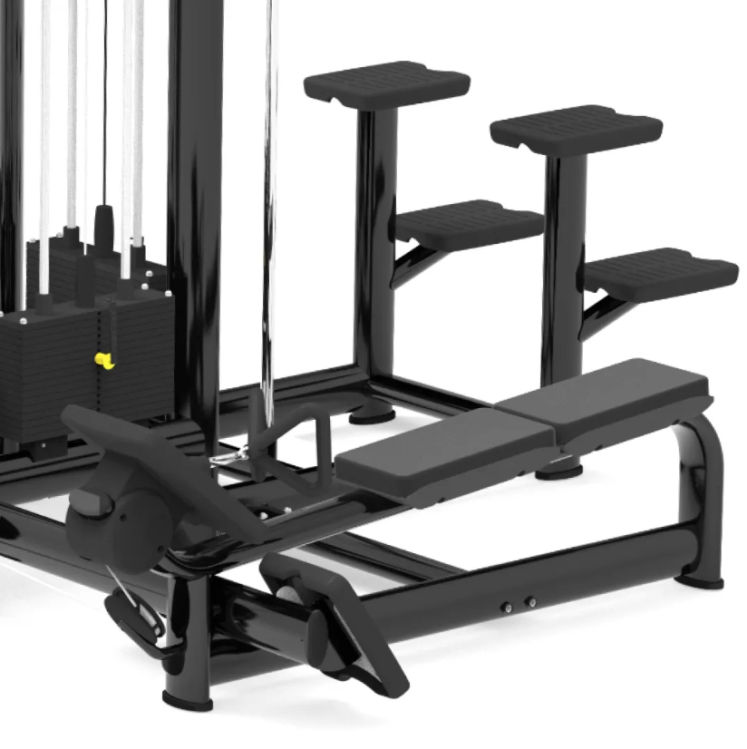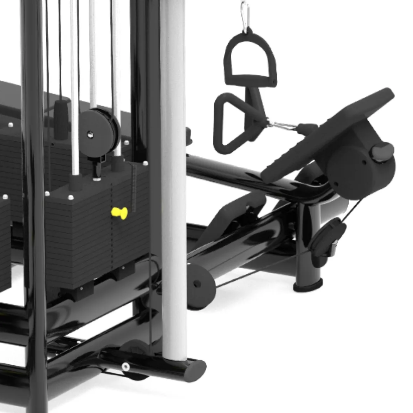 Инновационная конструкция, усиленная рама и возможность регулировки ключевых элементов делают станцию адаптируемой под пользователей любого уровня подготовки. Функциональные зоны: 1. Горизонтальная тяга сидя • Цель: развитие широчайших мышц спины и задних дельтовидных мышц. • Особенности: регулируемый угол хвата для индивидуальной нагрузки и вариативности тренировки. 2. Тяга сверху сидя • Цель: укрепление широчайших мышц и задних дельт. • Особенности: многоопорная система хвата для более широкой амплитуды и точечной проработки мышц. 3. Гравитрон (ассистент подтягиваний и отжиманий на брусьях) • Цель: эффективная тренировка мышц спины, груди, плеч и рук, включая начинающих пользователей. • Особенности: регулируемые турник, брусья и платформа для ног обеспечивают вариативность хвата и уровня поддержки. 4. Кроссовер (двойной функциональный блок) • Цель: выполнение изоляционных и функциональных упражнений на всё тело. • Особенности: свободная настройка положения блоков и хвата для точечной нагрузки на различные группы мышц. 5. Дополнительный блок (по типу универсального модуля) • Цель: расширение функциональности станции для различных тренировочных задач. • Особенности: совместим с аксессуарами (канаты, рукояти, тросы) для расширения упражнений. Технические характеристики: • Габариты: 5774 × 2926 × 2694 мм • Вес стека: 100 кг × 5 • Общий вес: 798 кг • Размер упаковки: — 1400 × 1350 × 2425 мм — 2500 × 700 × 850 мм — 1620 × 920 × 920 мм • Вес упаковки: 1000 кг • Рама: — плоская овальная труба 60 × 120 × 3.0 мм — плоская овальная труба 40 × 80 × 3.0 мм • Оснащение: — закрытый шкив для безопасности — анатомические рукоятки — противоскользящие подпятники — регулировка турника и брусьев