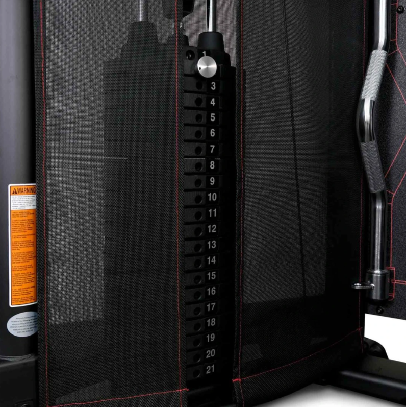Конструкция изготовлена из высокопрочного овального стального профиля 5 х 10 см с порошковым покрытием, устойчивым к механическим повреждениям и воздействию влаги. Весовые плиты выполнены из чугуна, что исключает вибрации и снижает уровень шума. Тренажёр имеет два независимых весовых стека по 96 кг каждый, а также 35 фиксированных положений высоты шкивов, благодаря чему пользователь может настроить тренировку под свои цели и физические особенности.