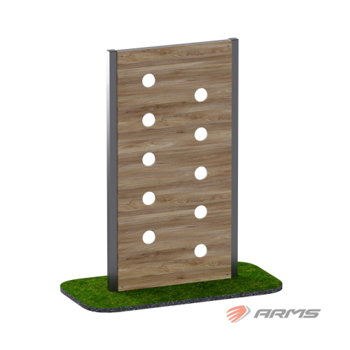 Элемент полосы препятствий «Стена для скалолазания» состоит из стального каркаса и влагостойкой фанеры с отверстиями для лазанья.