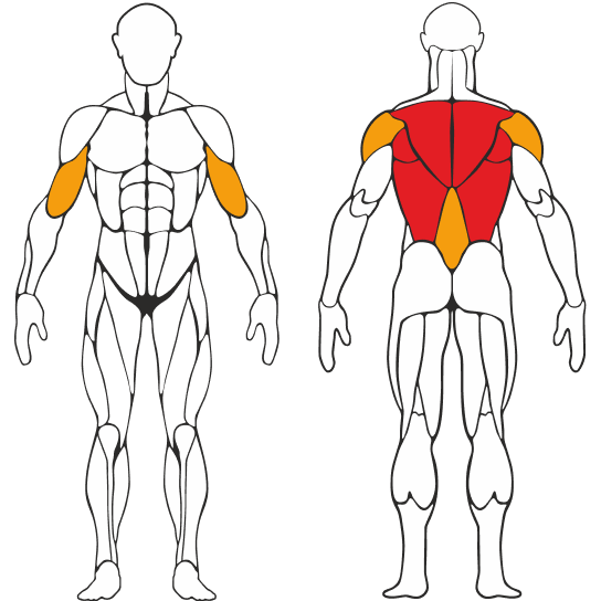 Тяга Т- грифа нагружает широчайшие, большие круглые мышцы спины, длинные разгибатели, трапециевидную, ромбовидную, задний пучок дельтовидных. В статике работают мышцы предплечий и бедер.