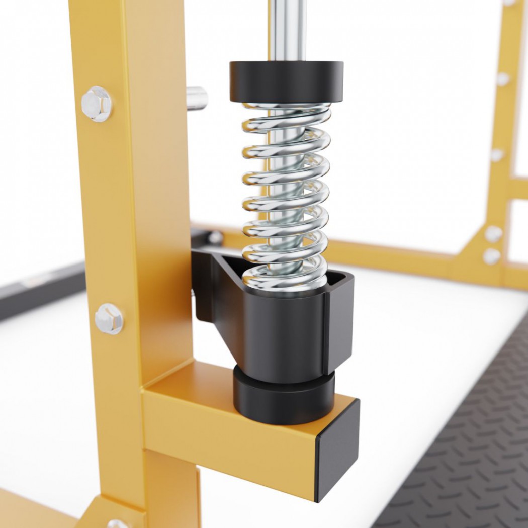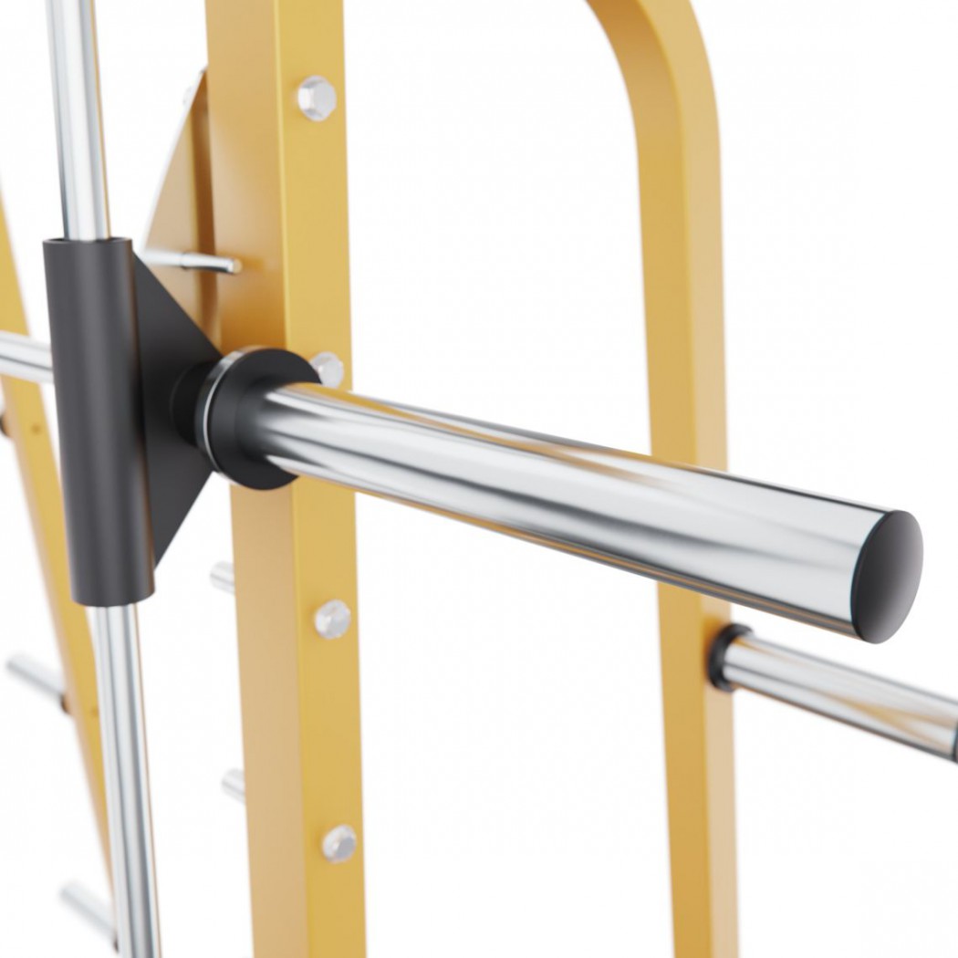 Каркас изготовлен из прочной стали с профилем 70 х 50 х 2 мм, что гарантирует устойчивость и долговечность конструкции. Машина оснащена встроенным грифом длиной 180 см с посадочным диаметром 50 мм и максимальной нагрузкой до 300 кг. Для хранения дисков предусмотрено 6 посадочных мест диаметром 50 мм, каждое из которых выдерживает нагрузку до 150 кг.
