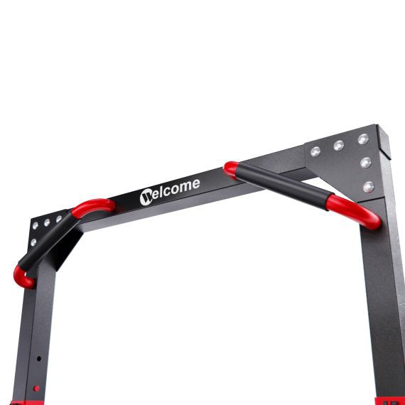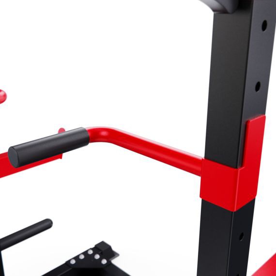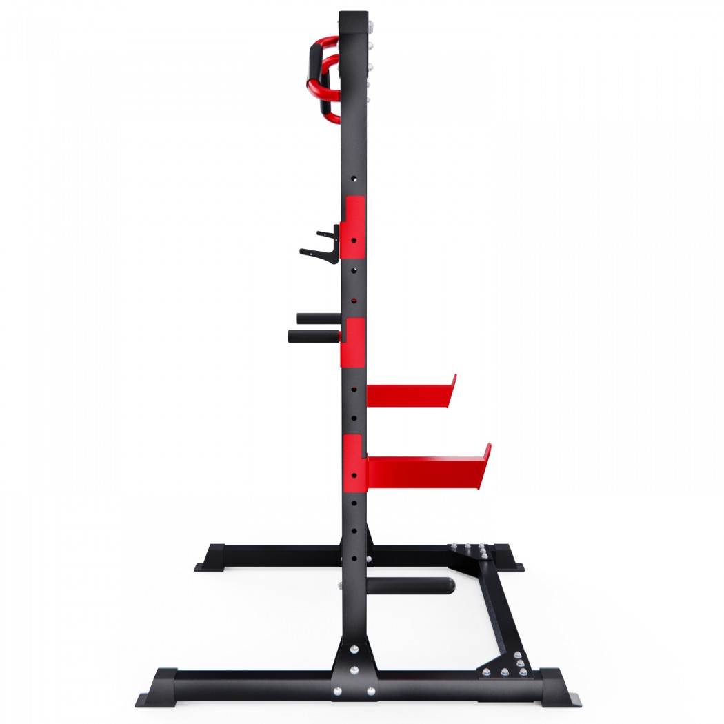2 пары держателей для штанги регулируются на 12 уровней по высоте. Максимальная нагрузка на держатели штанги 150 кг. Для хранения дисков предусмотрены 2 держателя по углам тренажера длиной 25 см (диаметр 25 мм), а также переходная втулка (диаметр 50 мм). Максимальная нагрузка на каждый держатель для дисков 60 кг. Нескользящие ножки надежно устанавливаются на полу и не царапают поверхность.