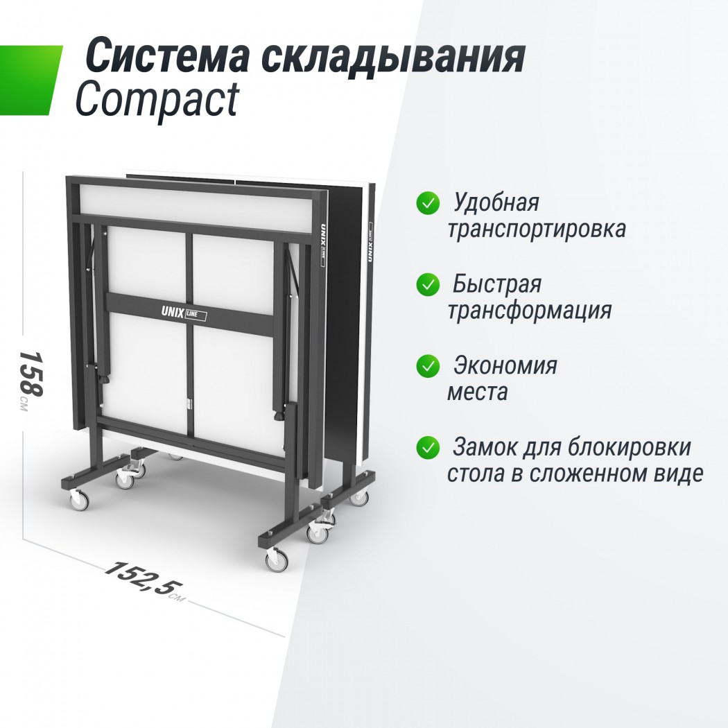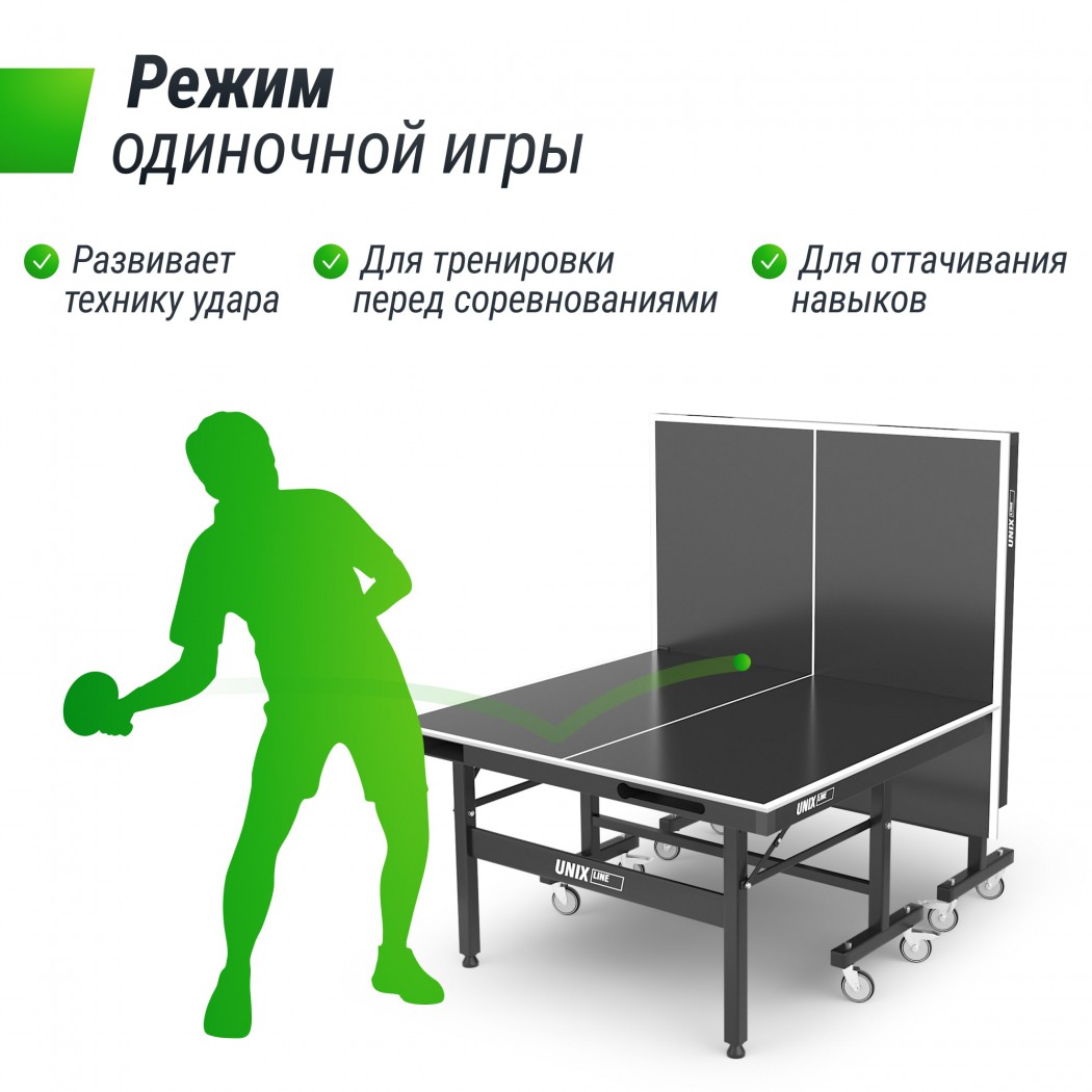 Стол оснащен надежной системой фиксации и тяжелыми ножками, что обеспечивает отличную устойчивость даже при сильном ветре или во время активных игр. Одну из сторон столешницы можно поднять для одиночной игры. Кроме того, наличие колесиков делает его перемещение простым и удобным.