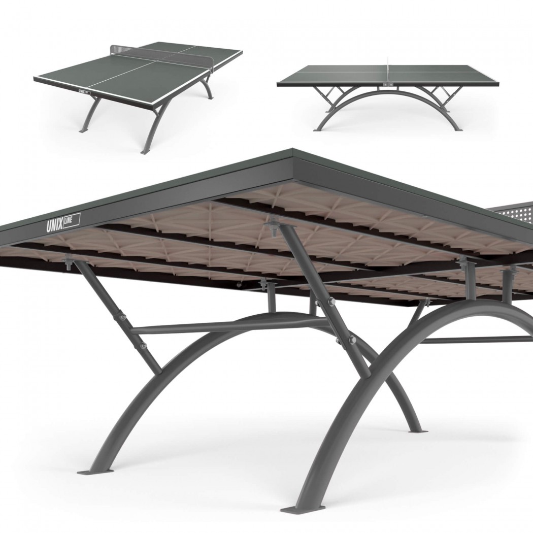 Столешница уличного стола UNIX Line изготовлена из SMС - панели с антибликовым покрытием и выдерживает многочисленные нагрузки, обладает хорошей устойчивостью к ударам, воздействию окружающей среды, влаге и температурным перепадам. Она не является горючим материалом, а также за счет высокой плотности и толщины столешницы (14 мм) обеспечивает великолепный отскок мяча и высокие игровые характеристики.