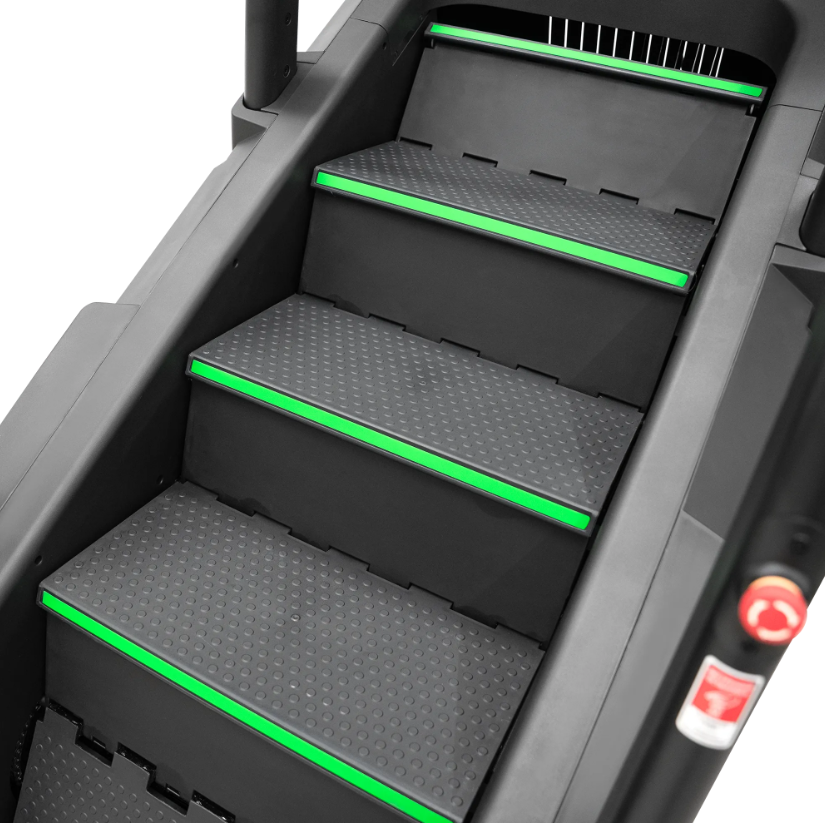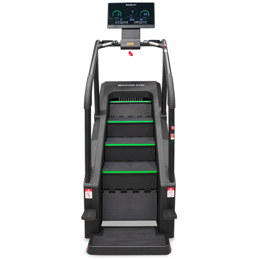 BRONZE GYM C1000M PRO TURBO — профессиональная лестница-эскалатор нового поколения для кардиозоны, где ценится надёжность, функциональность и комфорт. Модель создана с учётом высоких требований к оборудованию в залах с большой проходимостью. Усиленная конструкция, широкий диапазон скоростей, эргономичные поручни и нескользящие ступени обеспечивают уверенную и безопасную тренировку на всех уровнях подготовки. Инновационные технологии: Система EMS (электромагнитное сопротивление) для точного контроля нагрузки Современный LED-дисплей с интуитивным управлением Удобные рукоятки с кнопками быстрой регулировки Беспроводная зарядка для смартфона Расширенный функционал: 40 программ тренировок Контроль пульса, шагов, дистанции, калорий, уровня нагрузки 15 уровней интенсивности: от 14 до 160 шагов в минуту Угол наклона 35° (75%) Размер ступени: 500 × 260 × 183 мм 3 активные ступени, 9 в общей конструкции Безопасность и удобство: Самоблокирующаяся тормозная система Отключение при отсутствии пользователя Система защиты при весе менее 30 кг