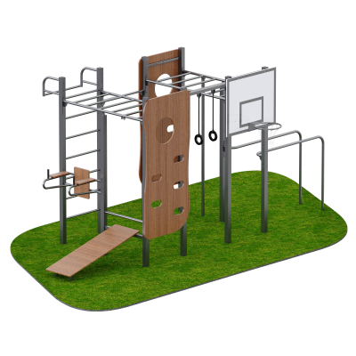 Металлические гимнастические кольца расширяют тренировочные возможности, позволяя выполнять упражнения на стабилизацию, силу хвата и баланс. Наличие баскетбольного щита и кольца добавляет игровой элемент, что делает комплекс привлекательным для детей и подростков.