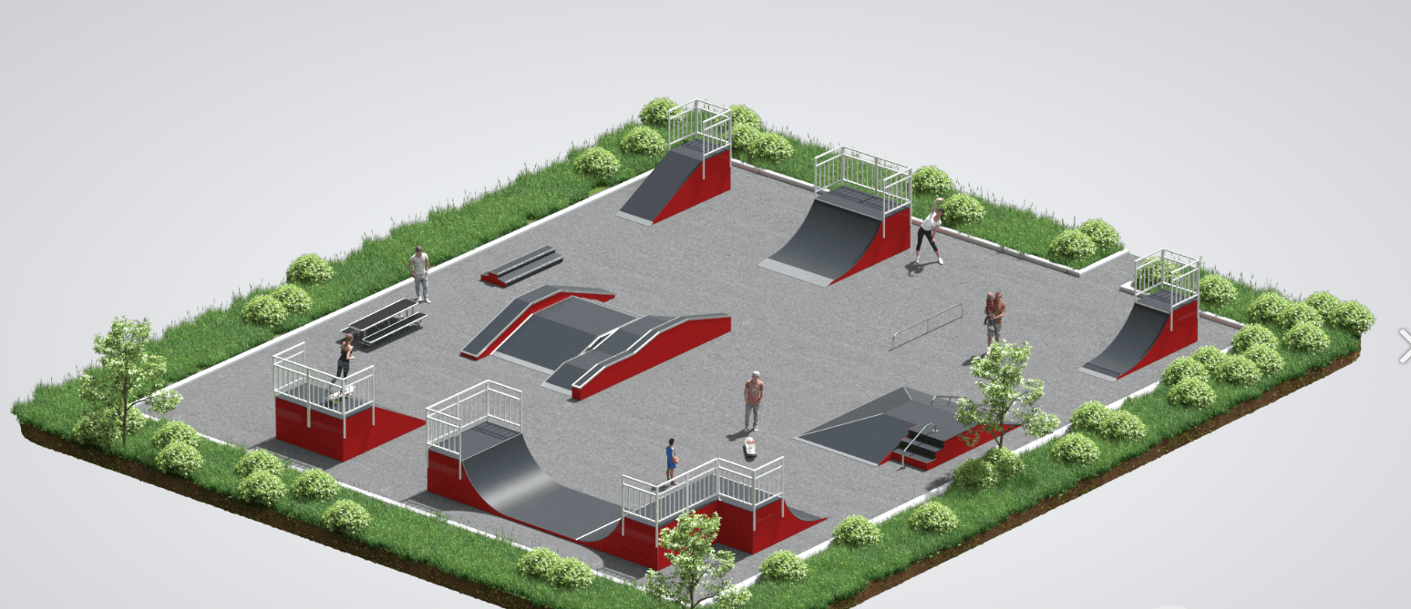 Такое сочетание элементов обеспечивает разнообразие рельефа и функциональность зоны катания. Наличие нескольких фанбоксов и радиусов позволяет формировать различные сценарии движения, а рампы и разгоны создают необходимую скорость для выполнения прыжков и трюков.